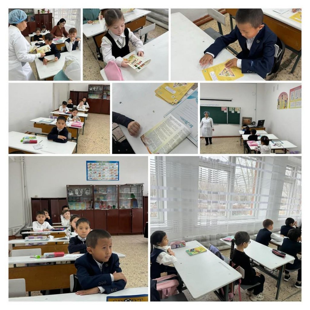 Мектеп медбикесі бастауыш сынып оқушыларымен бірге дұрыс және пайдалы тамақтанудың маңызы туралы әңгіме жүргізіп, сұрақ-жауаптар ұйымдастырды.